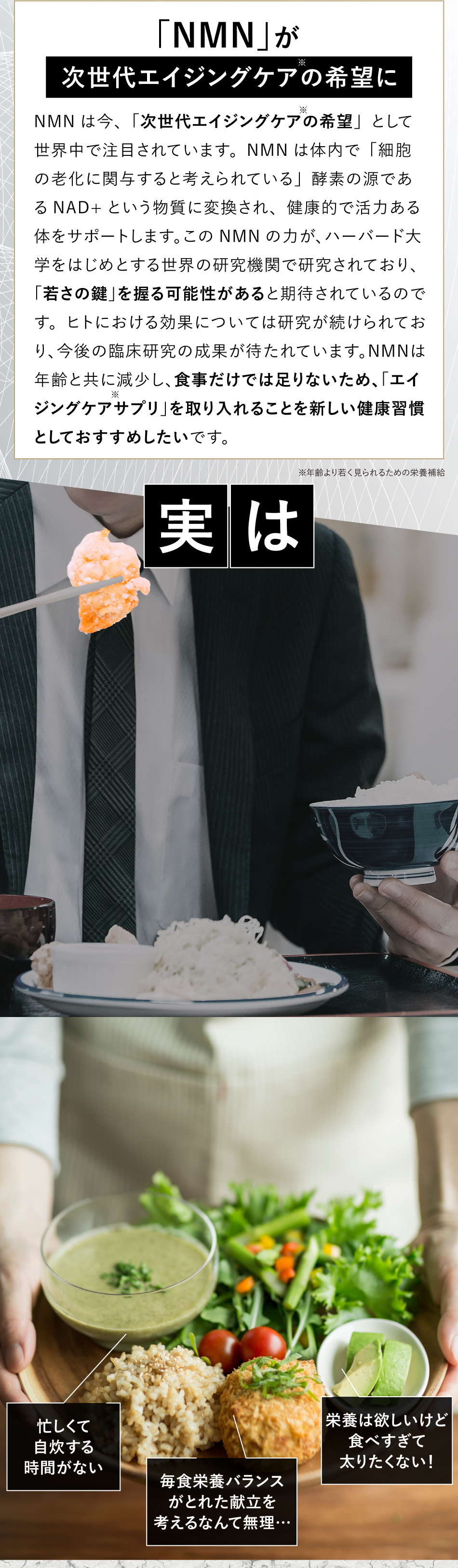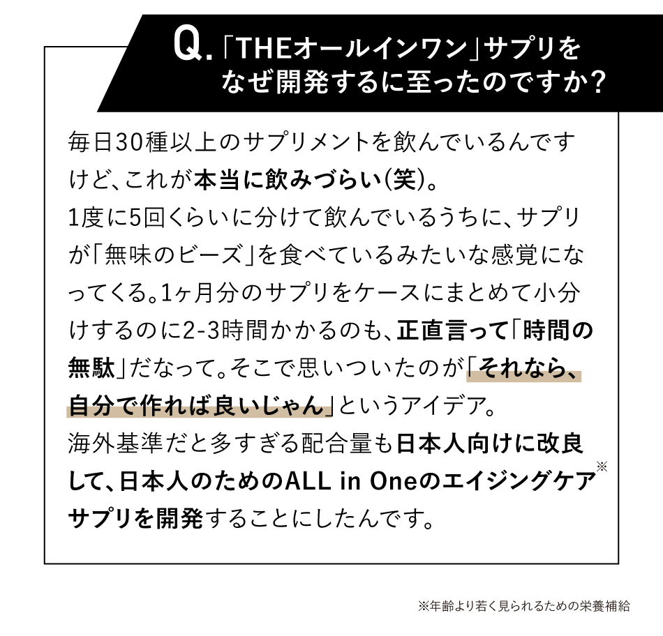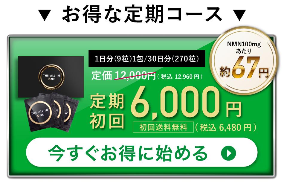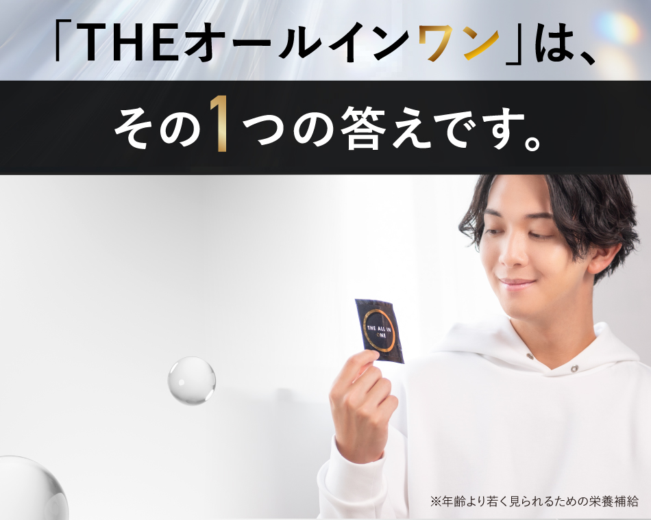 ※定期コースは2回目以降も10%OFFでのお届けです。 ※継続回数の縛りは一切ありません。 ※途中解約でも解約手数料は発生しません。 お使いのブラウザはvideoタグに対応していません。 ※定期コースは2回目以降も10%OFFでのお届けです。 ※継続回数の縛りは一切ありません。 ※途中解約でも解約手数料は発生しません。 お使いのブラウザはvideoタグに対応していません。 乗り換えよう ※定期コースは2回目以降も10%OFFでのお届けです。 ※継続回数の縛りは一切ありません。 ※途中解約でも解約手数料は発生しません。 Q.「THEオールインワン」サプリメントはどのような人におすすめですか? いつまでもカッコよくいたい男性、いつまでも美しくいたい女性、いつまでも若々しくありたいと思う、全ての忙しい現代人におすすめのオールインワンサプリです。 今の日本では、広告費をかけて広まったコスメや美容グッズであふれかえっています。美容と健康に本当に必要なのは、高い化粧水や美容液やフィットネスマシーンではなく、「肌とカラダを作る」食事やサプリだと考えています。肌は土台が綺麗な方がいい、ファンデがなくても明るく見える肌が理想、老けてみられるよりも若くみられた方がいい。 「THEオールインワン」は、これらのどれかに当てはまる全ての人におすすめしたいです。 Q.他のNMNサプリメントとの違いは何ですか? ①国内GMP認定工場製造かつ純度100%の最高級NMNを使用しています。 ②錠剤ではなく劣化が少なく、かつ胃酸に強い耐酸性カプセルタイプを使用しています。 ③広告費をかけず品質だけを追求しています。 NMNの摂取方法として最も理にかなっているのは、「カプセルタイプ」であると考えています。熱に弱いNMNを、錠剤のような「圧力をかける」製造工程で加工すべきではありません。また、カプセルタイプの中でも胃酸に強い「ハードカプセル」を採用し、NMNを守り切る設計にしました。 サプリは口に入れるものだからこそ、お金をかけるべきなのは、広告費ではなく原料の「品質」であると考えています。 Q.NMN以外のエイジングケア(※)成分は? 次世代エイジングケア(※)成分であるリポソームビタミンCやPQQ、プテロスチルベン、その他代表的な成分であるコエンザイムQ10やレスベラトロール、DHA/EPA、グルタチオンなど、全39種類の成分を、厚生労働省の定める基準量を考慮しつつ日本人に合わせた配合量で「アンチエイジングの本質」が一つ一つ厳選しています。 【成分一覧】 NMN/リポソームビタミンC/トランスレスベラトロール/DHA/EPA/コエンザイムQ10/α-リポ酸/ヒアルロン酸/コラーゲンペプチド/PQQ/プテロスチルベン/アスタキサンチン/リコピン/グルタチオン/ビオチン/ビタミンA/ビタミンD/ビタミンE/ビタミンB1/ビタミンB2/ビタミンB6/ビタミンB12/葉酸/ナイアシン/パントテン酸/L-シスチン/亜鉛/クロム/モリブデン/セレニウム、他多数 サプリメントの成分は多ければ多いほど良いというわけではありません。エイジングケア(※)に関するエビデンスがしっかりとあるものだけを摂るべきであり、逆に無駄な栄養素を摂ることは「良くない」とさえ考えています。 「THEオールインワン」サプリメントには、厚生労働省の定める基準量を考慮しつつさらには各栄養素それぞれの日本人の平均摂取量も調査した上で、不足している量を補えるように配合しました。「THEオールインワン」は日本人に完璧にフィットするように、隅から隅まで「隙のない設計」で開発されています。 ※年齢より若く見られるための栄養補給 Q.どのタイミングで飲むことが理想ですか? 1日1包(目安)をお好きなタイミングでお召し上がりください。 NMNはNAD+の前駆体であり、NAD+はエネルギー代謝や細胞修復サポートに関与します。そしてNAD+レベルは体内時計(サーカディアンリズム)に影響し、朝にピークを迎えると夜まで活力(元気)を維持できるため、朝の摂取が望ましいとされる研究が多くあります。逆に夜に摂取する場合、研究によると一部の人にとって、エネルギーが高まり活動的になりすぎると感じる可能性があります。 Q.どれくらいで実感できますか? サプリメントはダイエットのようなものです。すぐに実感を期待するのではなく、最低3ヶ月は続けてみて、日々の変化を感じてください。僕個人の体感としては、年齢よりも若く見られる、肌がキレイと褒められる、寝起きがスッキリした感じ、中年悩みが軽減された、仕事がバリバリ進められるようになった、など様々なシチュエーションで徐々に実感できるようになりました。皆さんにも同じような「変化」を体感してほしいです。 ※効果の保証ではありません。 Q.アレルギー物質は含まれていますか? アレルギー特定原材料8品目のえび、かに、くるみ、小麦、そば、卵、乳、落花生(ビーナッツ)、特定原材料に準ずる19品目は使用しておりません。 工場での混入も十分に配慮して製造しています。安心してお召し上がりください。 Q.グルテンフリーですか? グル